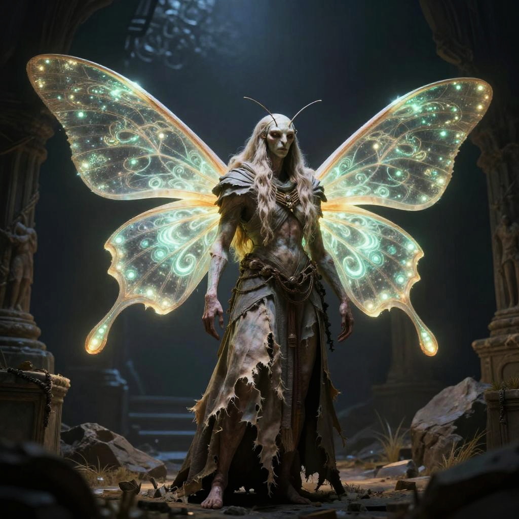 Moth humanoid in an ancient ruin, wearing tattered robes, bioluminescent patterns on wings glowing softly in dark surroundings, fantasy art style