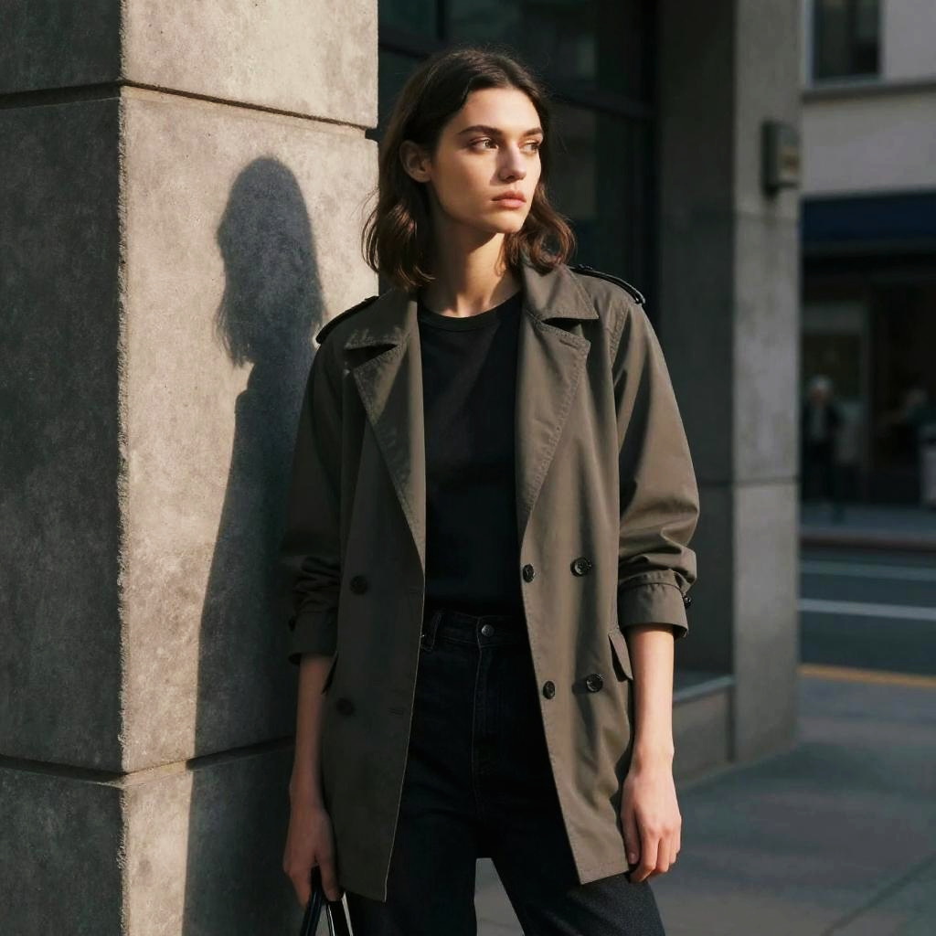 Pensive expression on a fashion model in an urban setting, dramatic shadows, sharp angles, muted urban colors, candid style photography with a contemplative mood and modern aesthetic