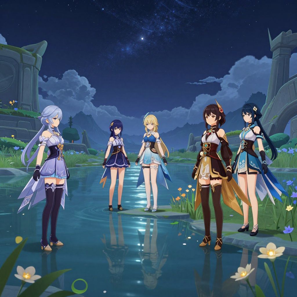 Genshin women characters by a tranquil lake under a starry sky, soft moonlight reflecting on the water, detailed nature surroundings with flowers and ancient ruins, fantasy art style, elegant and serene mood, intricate costume designs, painterly style.