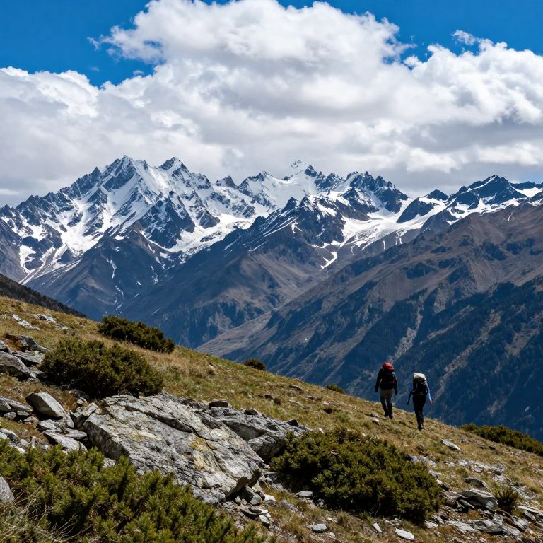 Photograph of a mountainous landscape featuring two hikers in the foreground, walking away from the camera on a rocky, grassy hill. The hikers, dressed in dark outdoor gear and red and blue hats, are positioned on the right side. Behind them, a vast, snow-capped mountain range stretches across the horizon under a vibrant blue sky with scattered white clouds. The rocky hill is dotted with small bushes and has a textured, uneven surface. The image captures the contrast between the dark, rugged terrain and the bright, crisp snow on the mountains, emphasizing the natural beauty and grandeur of the scene.