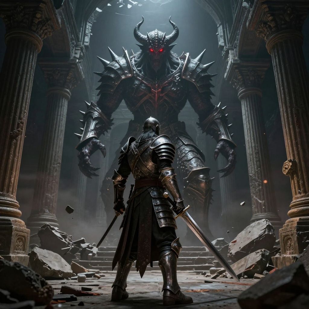A dark fantasy scene depicting a heavily armored warrior with a sword standing in a ruined ancient temple, confronting a towering demonic figure with spiked armor and glowing red eyes. The setting is surrounded by broken columns and stone debris, emphasizing an intense and ominous confrontation in an epic medieval fantasy style.
