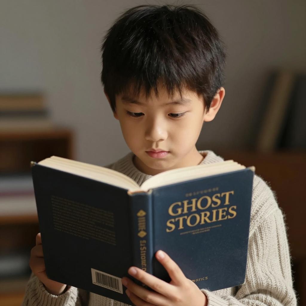 Boy with short dark hair, white shirt, focused on writing at dimly lit table, illuminated by vintage lamp. Table has bowl, small figurines, patterned cloth, white chairs. Dark, patterned curtains in background. Low, warm light creates shadows.