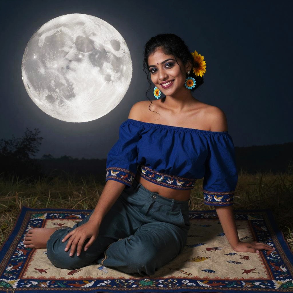 Solo, looking at viewer, smile, shirt, bare shoulders, jewelry, sitting, full body, flower, earrings, pants, off shoulder, crop top, makeup, bird, border, moon, full moon, off-shoulder shirt (realistic:1.2), (realism), (masterpiece:1.2), (best quality), (ultra detailed), (8k, 4k, intricate), (full-body-shot:1), (85mm), light particles, lighting, (highly detailed:1.2), (detailed face:1.2), (gradients), sfw, colorful, (detailed eyes:1.2)(detailed background), detailed landscape, (dynamic angle:1.2), (dynamic pose:1.2), (rule of third_composition:1.3), (Line of action:1.2)