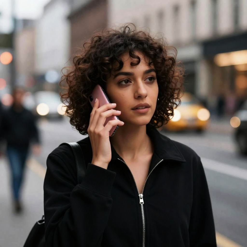 Photograph of a young woman with long black hair, wearing a red and white striped blouse and blue jeans, sitting at a green wooden table, looking at her phone. A white cup and plate are on the table. Behind her, a person in a maroon shirt and another person in a beige shirt are visible. The background includes steps, plants, and a brick building.
