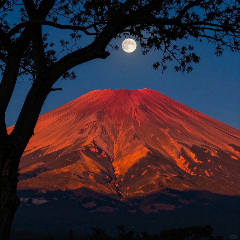 Photograph of a vibrant red volcanic mountain under a full moon, silhouetted by dark tree branches, against a deep blue night sky.