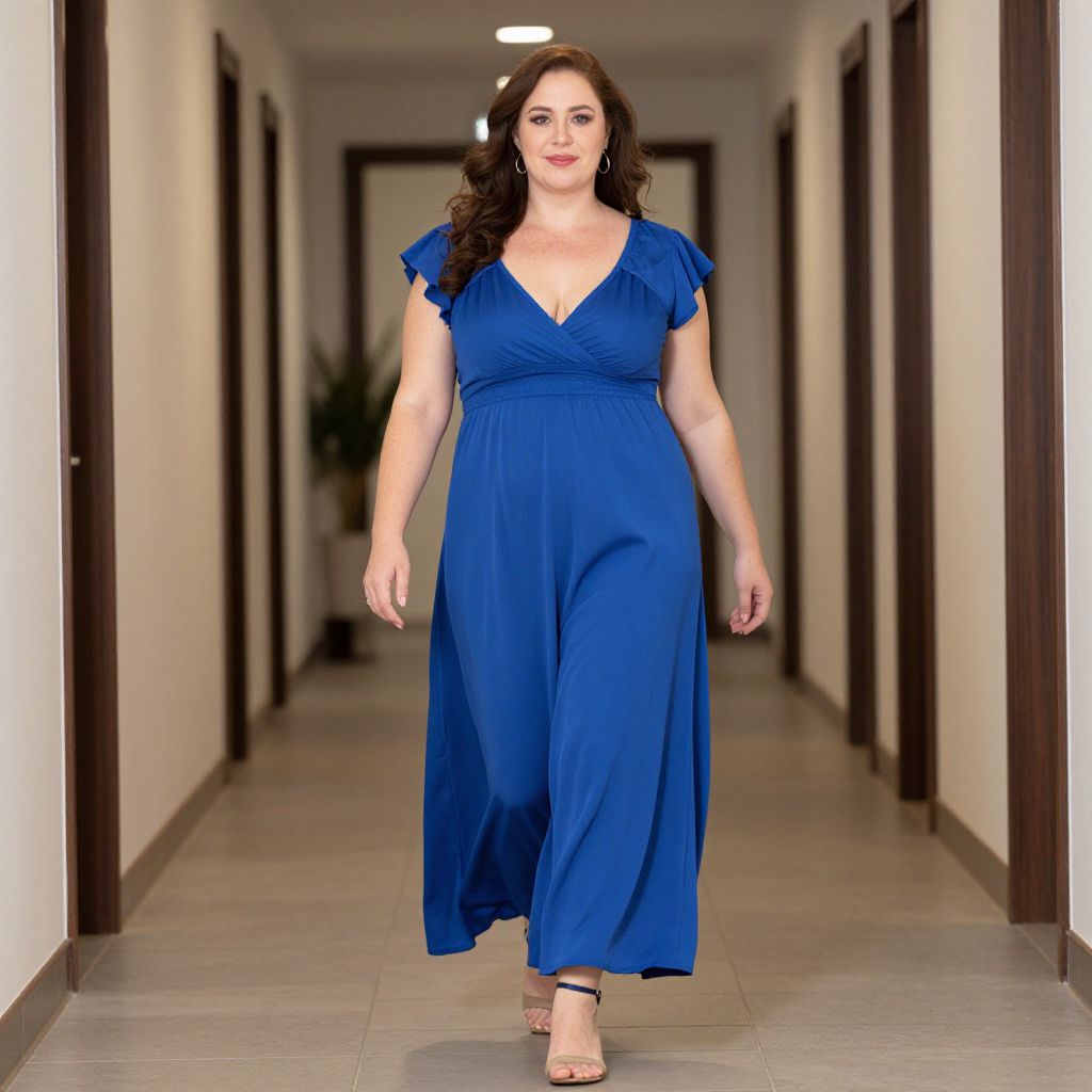 Plus Size Cruise Wear Costume, a woman in a blue dress is walking down a hallway