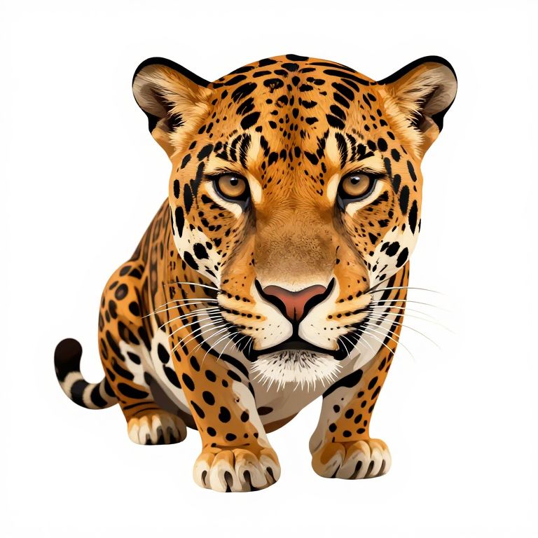 A detailed, photorealistic vector illustration of a Brazilian Jaguar character, looking directly at the viewer, with a cartoon style and realistic features on a white background.