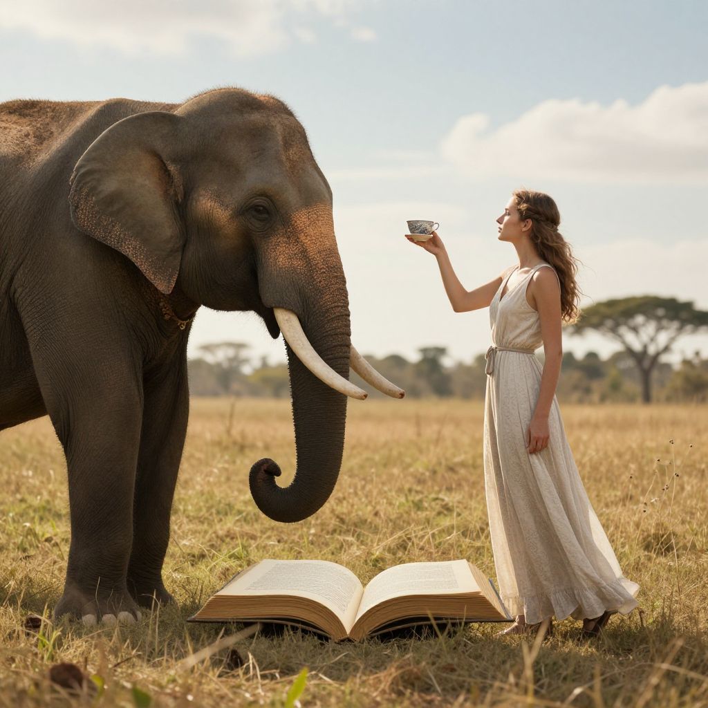 In a surreal tableau of serenity and wonder, a woman in a sunlit field stands beside an elephant, her teacup held aloft as if offering a shared moment of reflection, while an open book lies between them, hinting at the timeless dialogue between humanity and nature under skies that whisper stories of eternity.