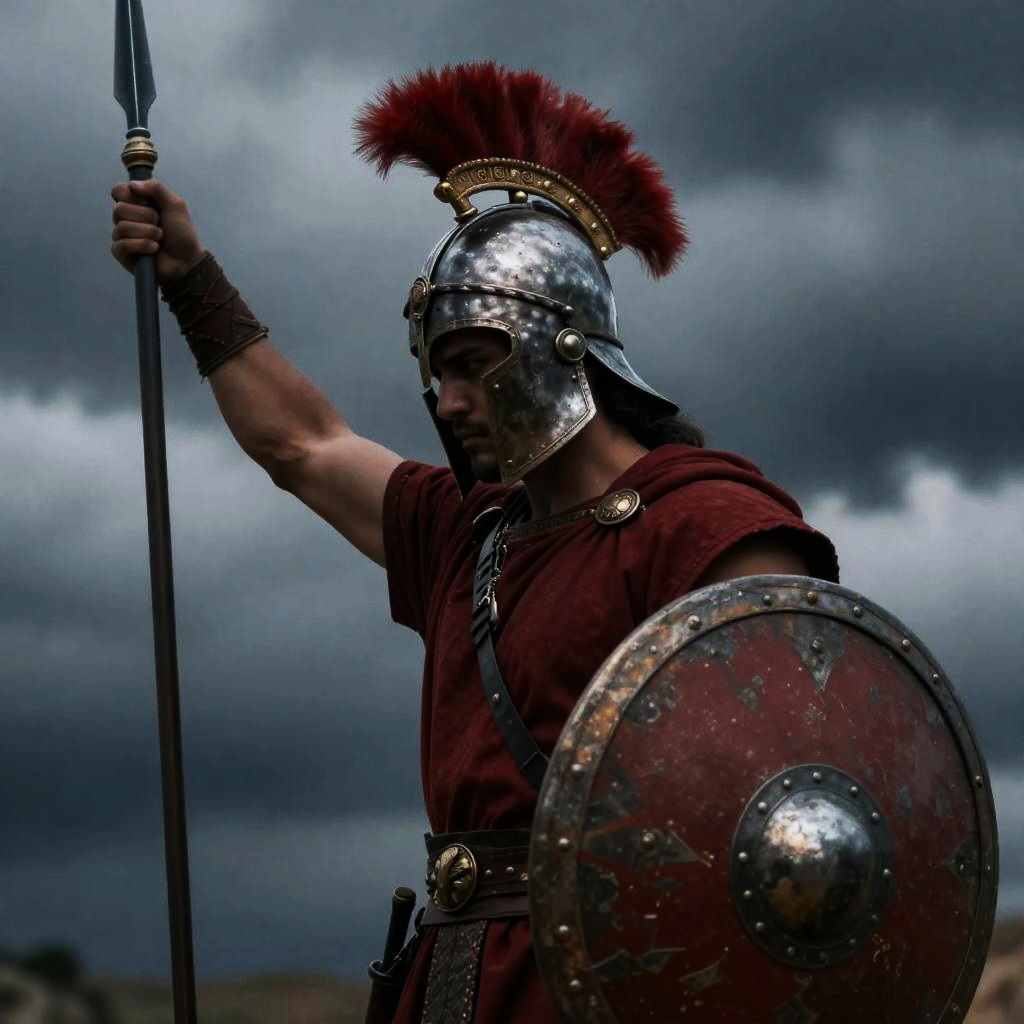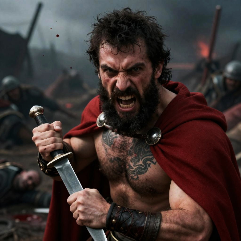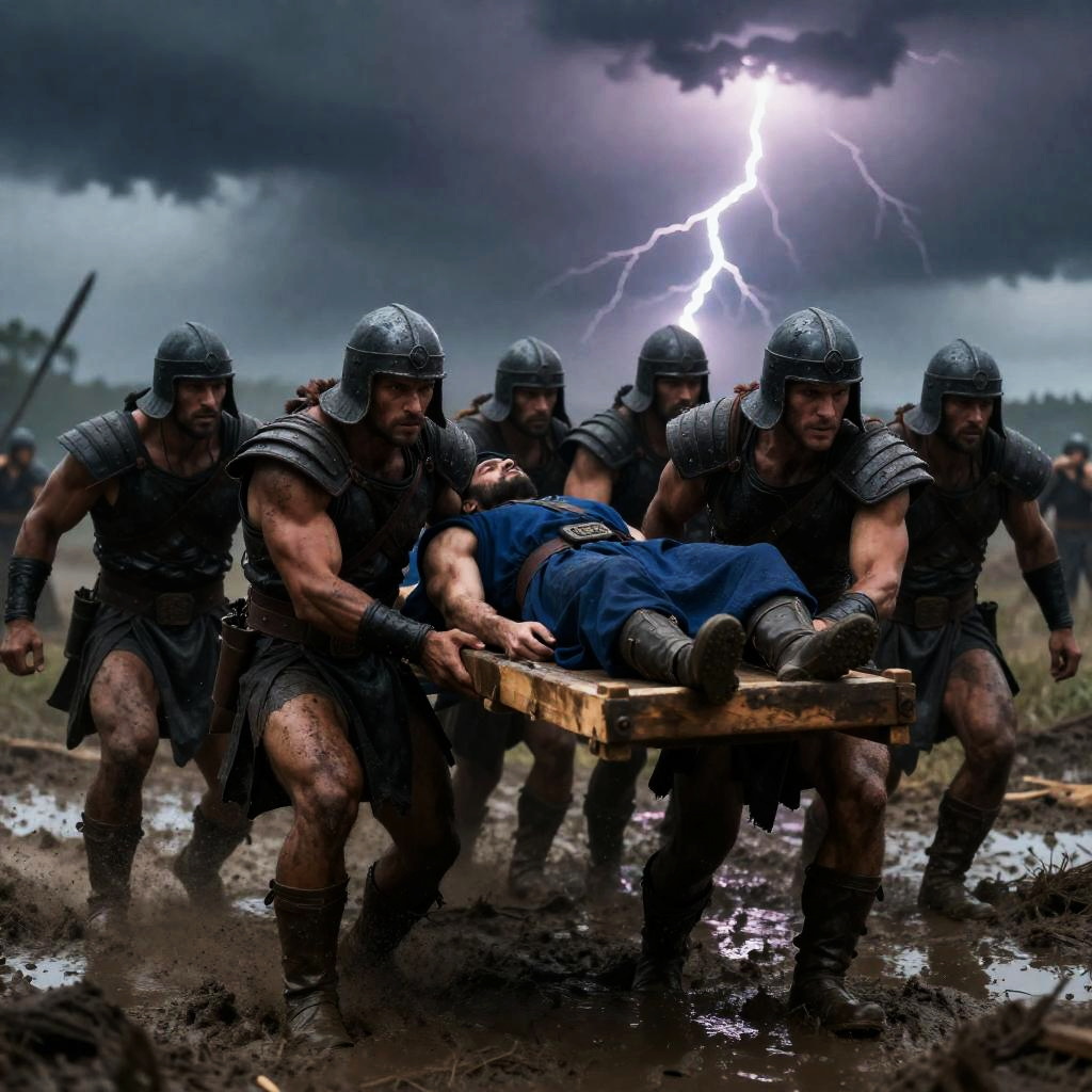 Group of muscular warriors in dark armor and helmets, pulling a blue-clad figure on a wooden stretcher through a muddy, stormy battlefield. Dark sky with lightning in the background. Intense expressions. Six warriors, one being pulled.