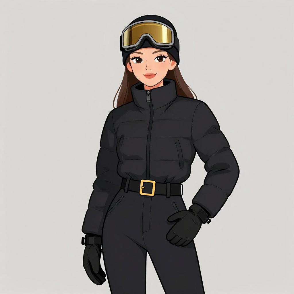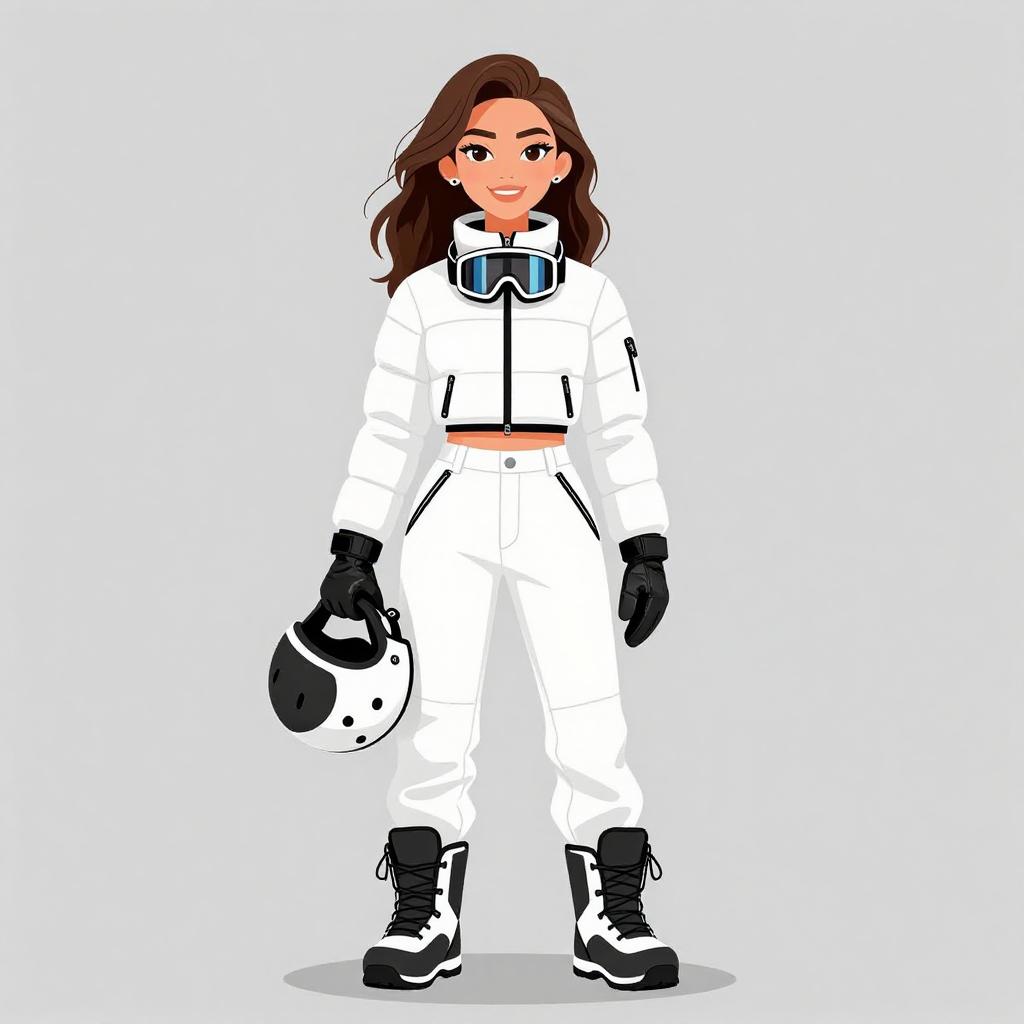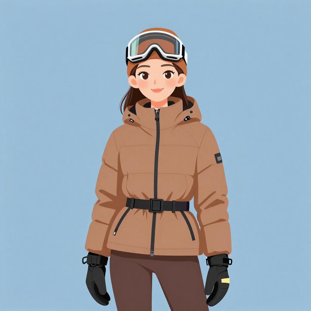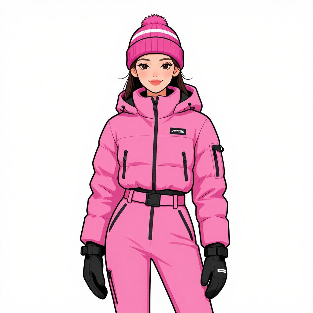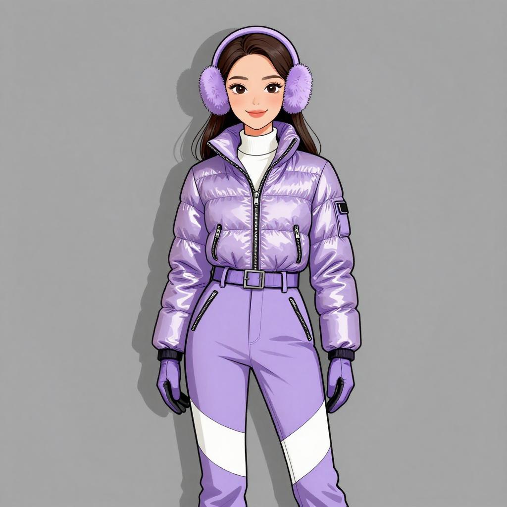 Woman with pretty face and pretty hair. smiling Woman, sporty winter chic, oversized puffer jacket with pastel pink and purple gradient, high collar, cropped length, diagonal zippered pocket, matching iridescent leggings with pastel pink and purple tones, moisture-wicking fabric, ski goggles with orange tinted lens, white insulated gloves, light pink beanie, standing pose with one hand on hip, studio --sref 1467