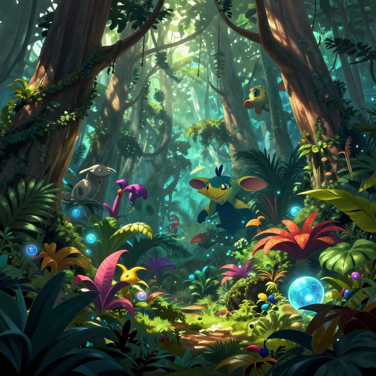 Hoenn-themed wild forest scene, dense tropical rainforest with colorful exotic plants, mystical glowing orbs, rare fantasy creatures hiding among huge trees, cinematic lighting with dramatic shadows, ultra-detailed digital painting