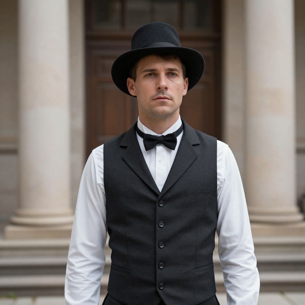Photograph of a Caucasian man with light skin, wearing a black wide-brimmed hat, white dress shirt, black bow tie, and black waistcoat. He has a serious expression and short brown hair. The background features a classical architectural setting with large, beige stone columns and a dark wooden door. The image has a sharp focus on the man, with the background slightly blurred. The overall style is formal and elegant, suggesting a historical or vintage theme.