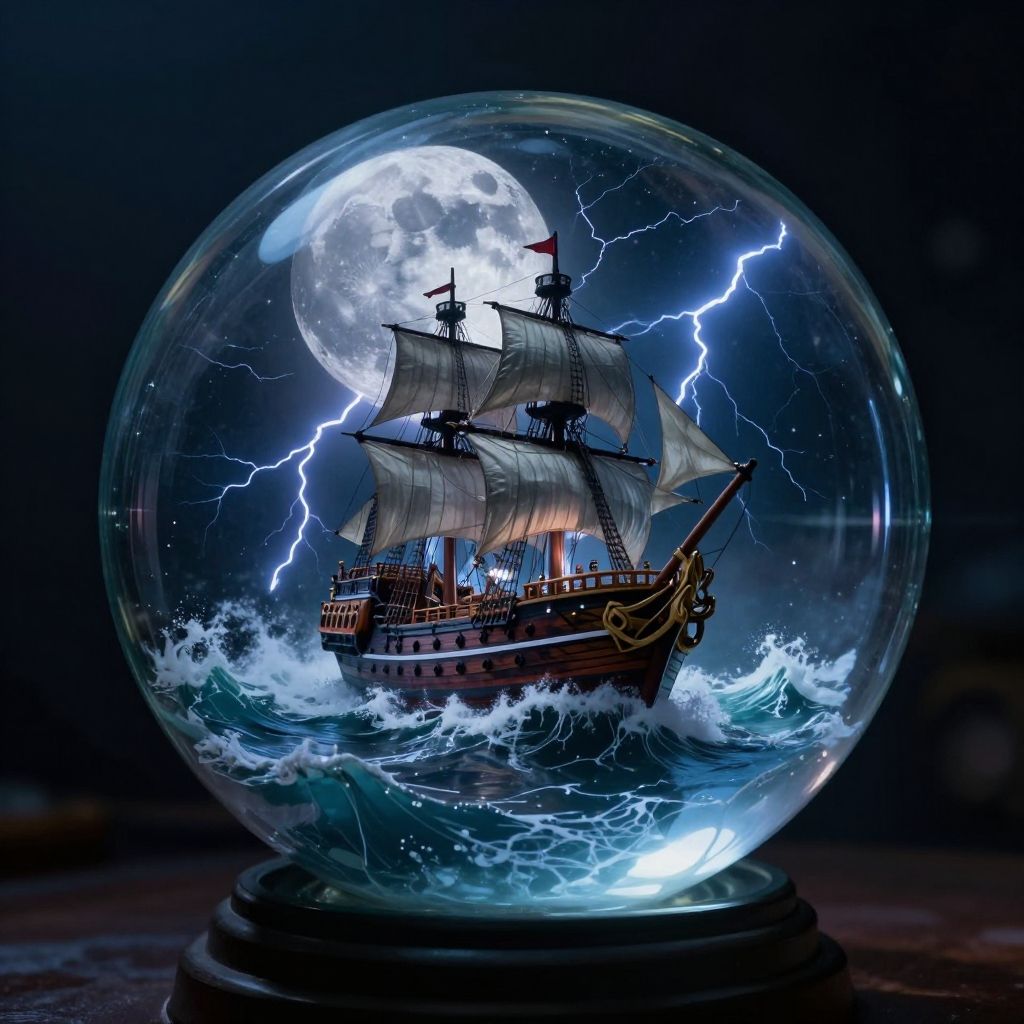 Extremly detailed (background), (focus background), (UHD:1.1) high quality perfects lighting (detailed background visible:1.2)(Style: subsurface scattering (pui) analog style realistic film photography highres photo cinematic Lighting trending on artstation)(Photorealistic:1.2)(detailed) sharp HDR high quality good resolution maximalist masterpiece(Golden ratio)Raw Photo realistic DSLR subsurface scattering analog style (Photorealistic:1.2) (detailed hyperrealism)detailed Olympus PEN-F with M.Zuiko 17mm f-1.8 photograph of A glass sphere sculpture concealed inside the sphere is a large Pirate Ship in a Lightning storm large waves in the dark detailed image the moon shaped sphere(color scheme:Non-photo blue Spanish carmine)(reaching towards viewer:1.00)