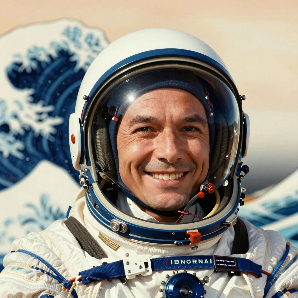 A captivating portrait of Yuri Gagarin in the style of Katsushika Hokusai, showcasing his pioneering smile and reflective helmet visor against a softly shaded background.