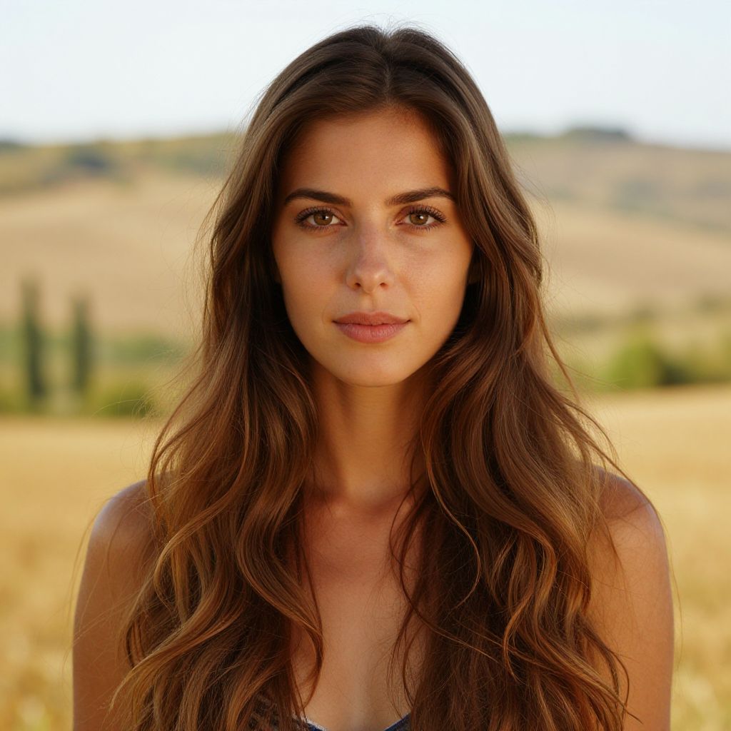 Portrait of a woman with Italian long hair, sun-drenched Tuscan landscape behind, soft focus, natural highlights in hair, warm tones, painterly style with fine detail