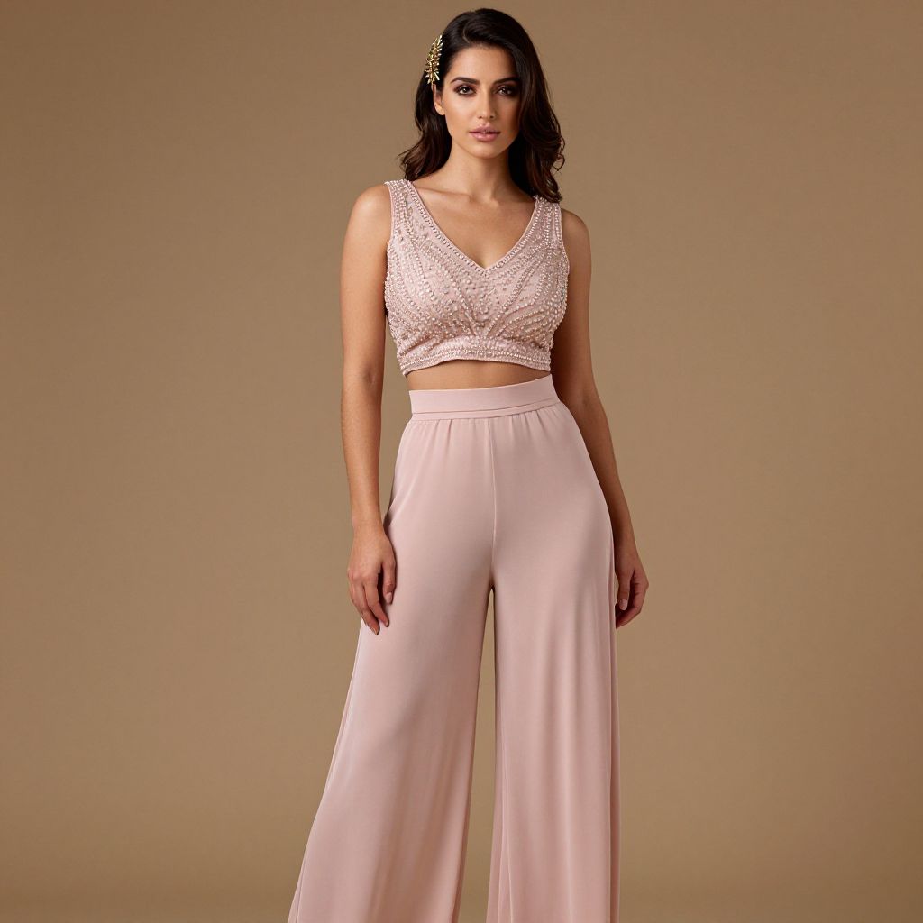 "Woman, modern romantic, blush pink two-piece ensemble, cropped top with intricate beaded embroidery, V-neckline, sleeveless, high-waisted palazzo pants, wide-leg design, flowing fabric, simple thin waistband, gold leaf hair accessory, studio backdrop with warm neutral tones.. Sexy. Pretty face and beаutiful eyes. Big breasts."