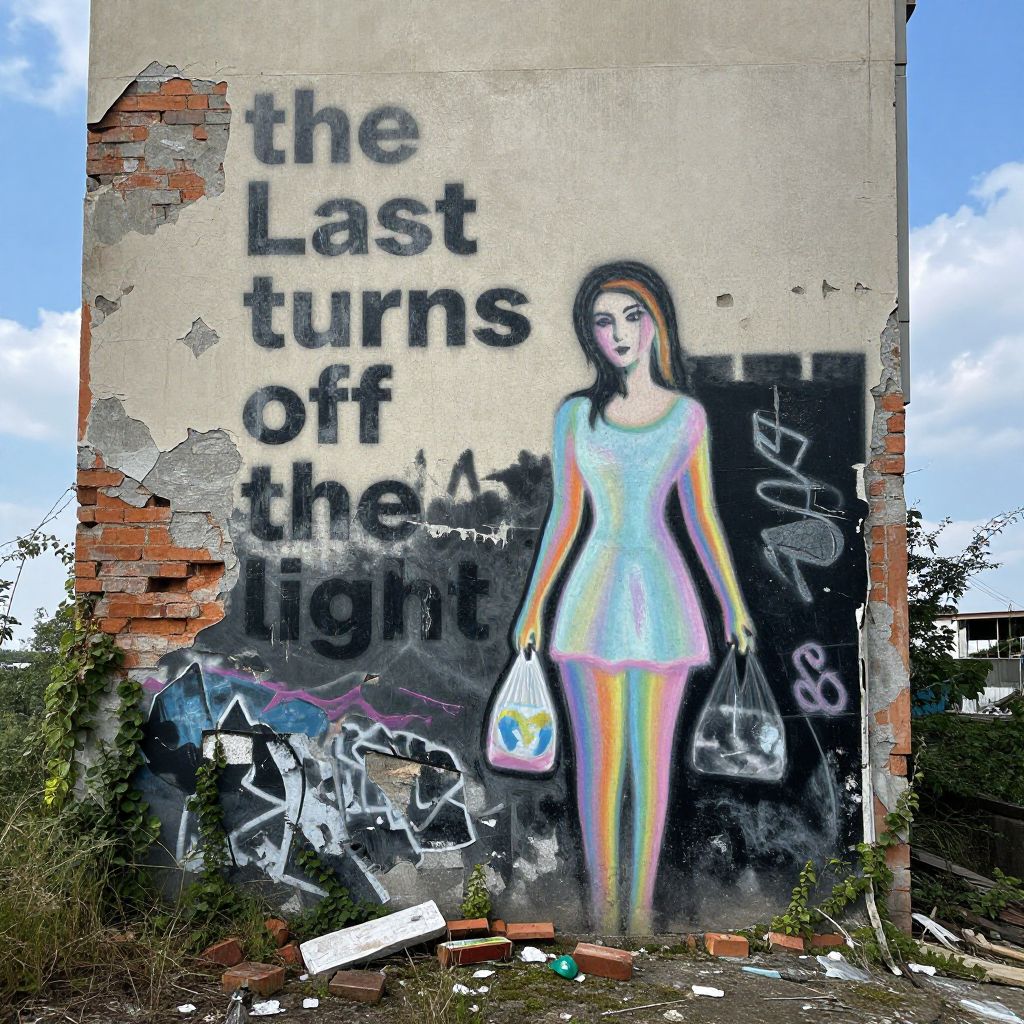 Photograph of an abandoned high-rise building against a deep night sky, The facade is decaying, with broken bricks and shattered windows, while stones have fallen from the crumbling surface, A striking, weathered graffiti of a rocket is painted on the wall, soaring upward, Though faded and peeling, the rocket still radiates a sense of aspiration, with the words 'to new worlds' written beneath it, Below, in smaller text, the message 'the old one is broken' can be seen, hinting at the state of both the building and the world it represents, The vibrant yet worn graffiti almost merges with the night sky, only distinguishable by the peeling paint and crumbling wall, Despite its decay, the scene evokes a feeling of hope and the possibility of a new beginning