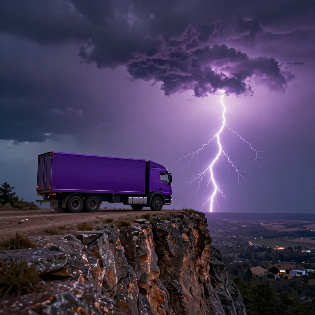 Photograph of a purple cargo truck parked on a rocky cliff at night, under a dramatic, stormy sky. A vivid, bright purple lightning bolt splits the dark clouds, illuminating the scene with electric light. The truck is silhouetted against the lightning, with its rear facing left. The cliff is rugged with visible texture, and below, a distant landscape with scattered lights can be seen. The overall color palette is dominated by deep purples, blues, and natural rock tones, creating a striking, almost surreal atmosphere.
