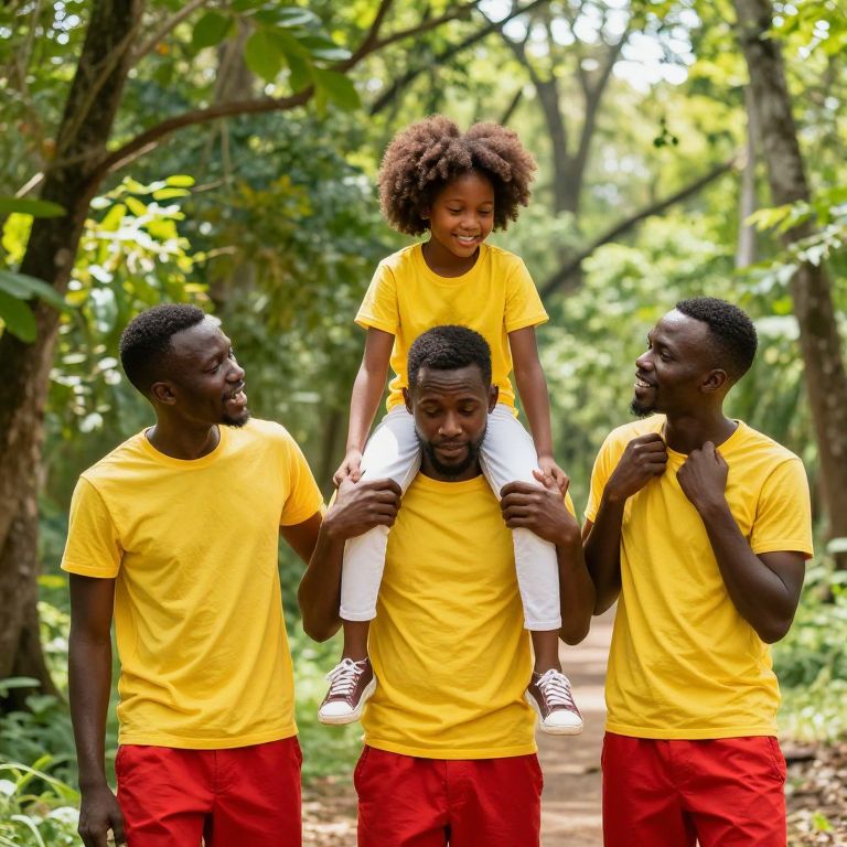 Photograph of four African-American individuals in a forest. Three men, wearing yellow shirts and red shorts, stand in a row; the man in the center carries a smiling young girl with curly hair, wearing a yellow shirt and white pants, on his shoulders. The men have short hair, are smiling, and are looking at the girl. The background features lush green trees and a sunlit path. The image has a vibrant, natural color palette and a joyful, family-oriented atmosphere.