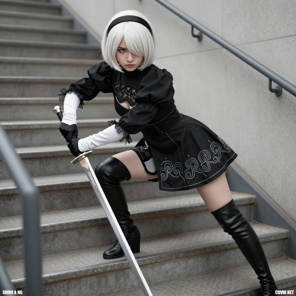 Cosplay photograph of a young woman with pale skin, short white hair, and a black hairband, kneeling on one knee. She wears a black and white outfit with a deep neckline, black thigh-high stockings, and red lipstick. She holds a large, patterned sword with her right hand. The background includes a gray, metal structure and a brown fabric. Her intense gaze is directed at the camera.