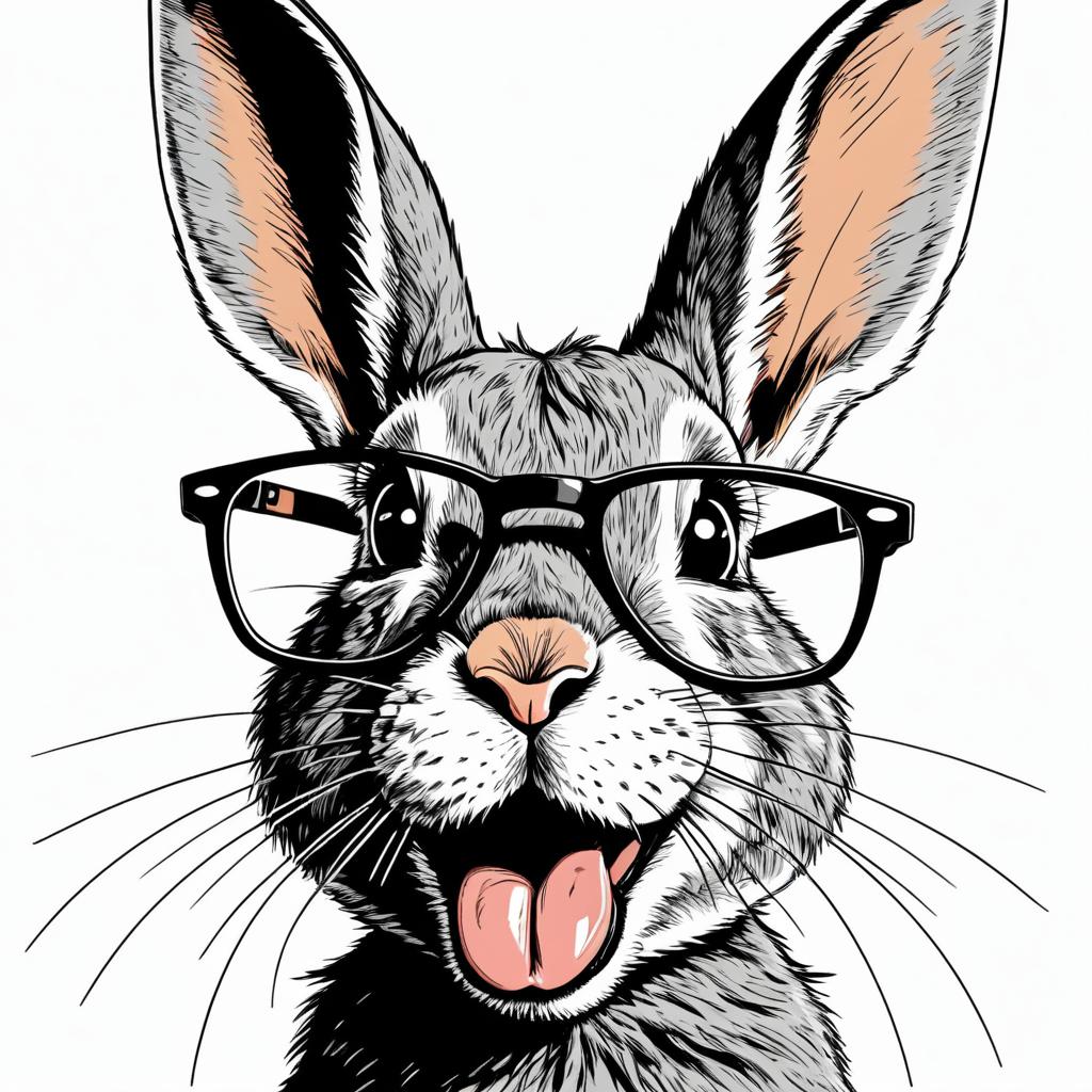 Close-up cartoon illustration of a goofy rabbit with exaggerated eyes, wearing black glasses. The rabbit has its tongue out in a playful expression, featuring medium detail, flat colors, and strong black contour lines on a white background.