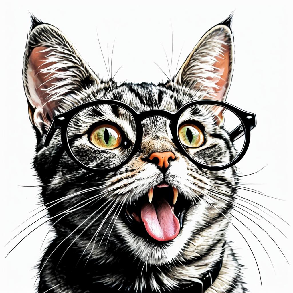 Close-up portrait of a goofy rabbit with its tongue out, wearing glasses. Cartoon style with medium detail, 2D, flat colors, strong black contour lines, white background, eyes exaggerated in foreground, humorous and playful