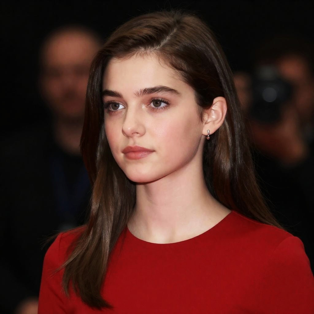 Photograph of a young woman with long dark brown hair, light skin, and a serious expression. She wears a sleeveless black top with a beaded necklace. Seated in a blue upholstered theater seat, slightly blurred person in front holds a phone. Background includes another seated person with a patterned shirt.