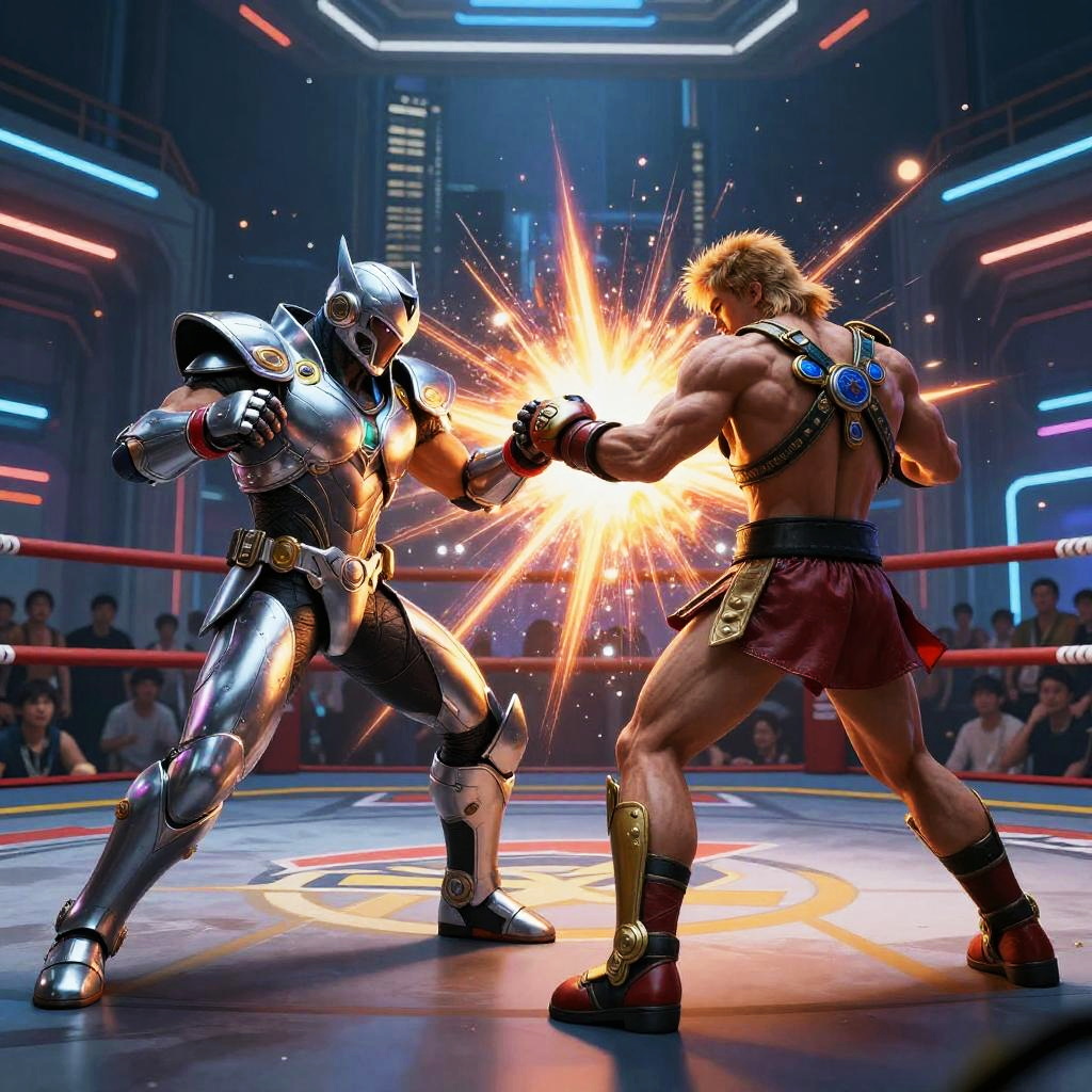 Oil painting of lucha libre wrestlers styled in Basquiat’s art. The scene has a raw, energetic vibe with expressive strokes.