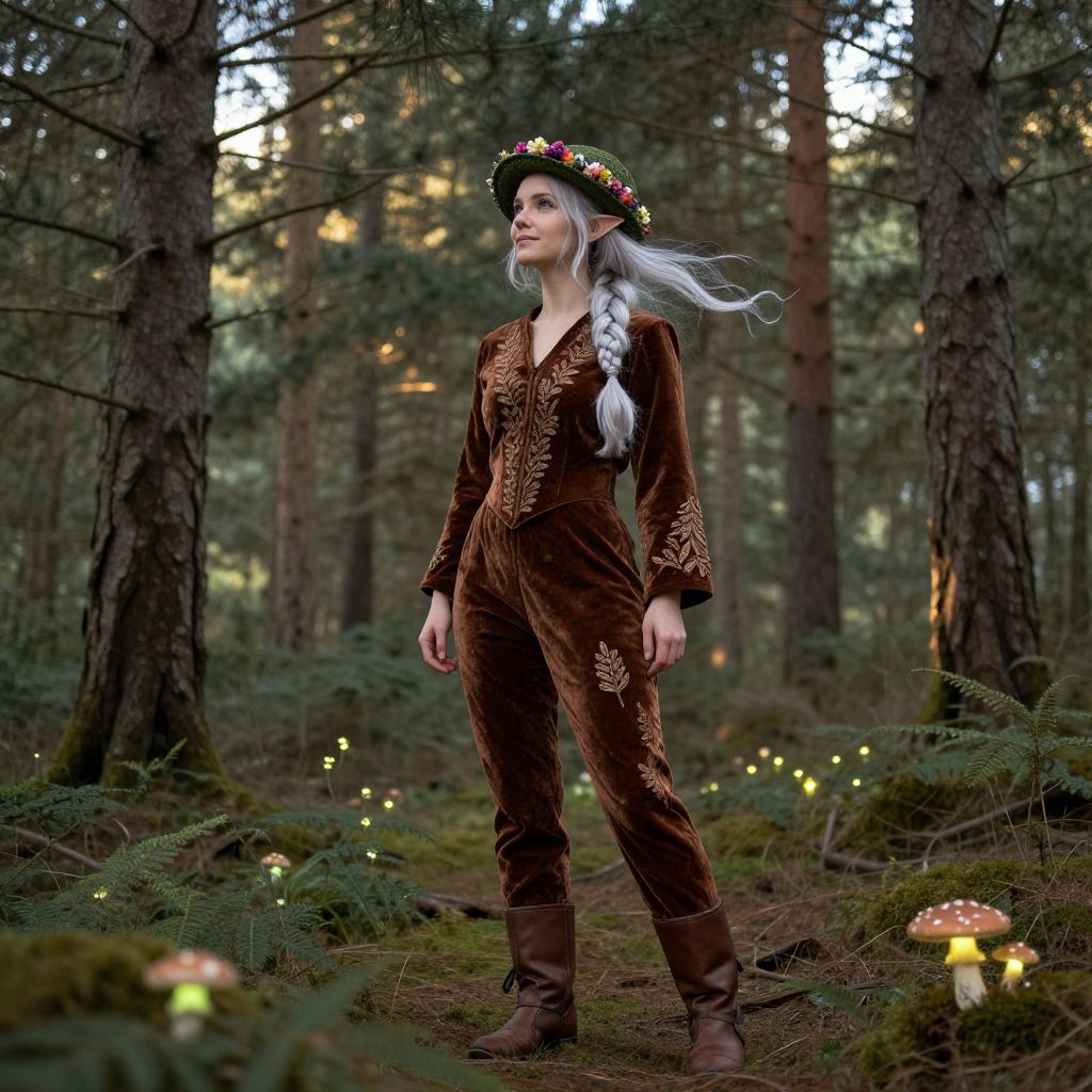 A graceful female elf woman with silvery-blue eyes that shimmer with ancient wisdom and soft, flowing silver hair tied in a delicate braid that gently dances in the breeze, wearing a warm brown velvet outfit intricately embroidered with detailed leaf patterns that seem to pulse with life, a green woven hat adorned with tiny, vibrant blossoms that sway gently in the wind, and sturdy brown leather boots that keep her grounded despite the magical surroundings. She stands in a sun-dappled forest clearing, where towering pine trees rise like sentinels, their branches arching overhead to let dappled sunlight filter through, and bioluminescent mushrooms glow softly in the underbrush, casting a serene, otherworldly light. Her presence radiates a calm, mystical aura—peaceful, wise, and deeply connected to nature—her gentle smile speaks of quiet joy and timeless harmony with the world around her.