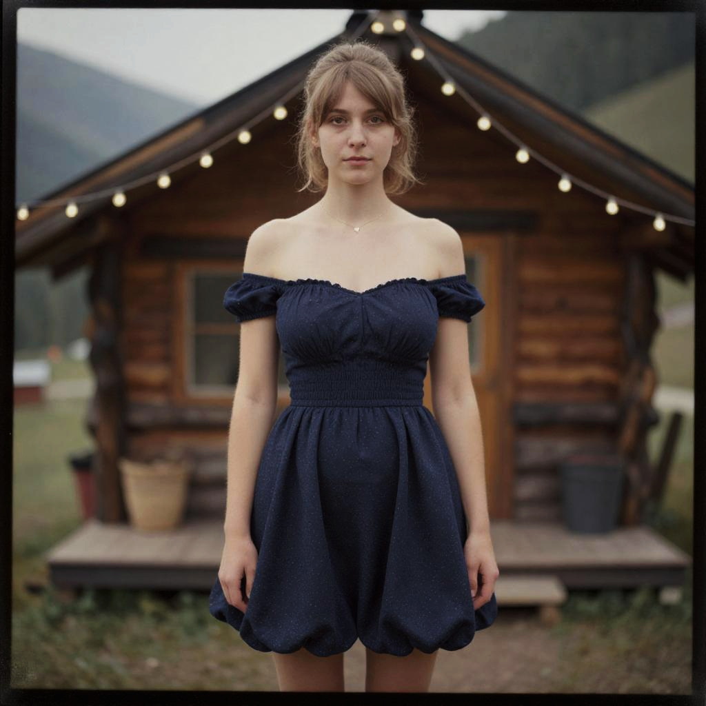 A willowy woman in a chic navy short dress with cold-shoulder design and flared skirt, captured in the visual style of the Calotype process, stands under string lights in a mountain cabin. Sexy. Pretty face and beаutiful eyes. Big breasts