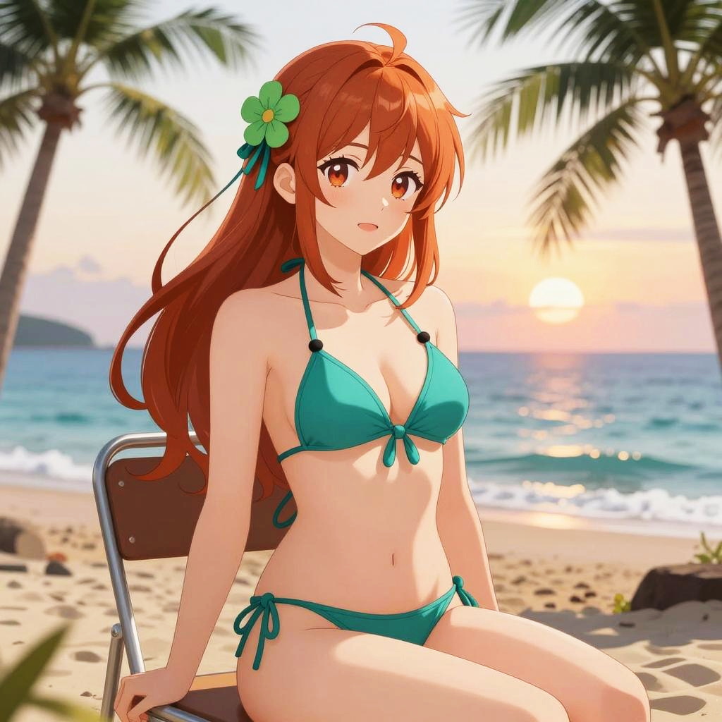 A beautifully detailed digital illustration of a young woman with long auburn hair styled with a green flower accessory, wearing a teal bikini with black accents. She is seated on a chair at a serene beach setting during sunset, surrounded by palm trees and calm ocean waves, rendered in a vibrant, semi-realistic anime style.