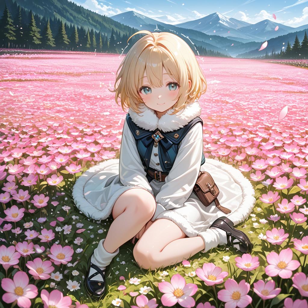 Masterpiece, best quality, 1girl, sitting, ahoge, blonde hair, blue eyes, fur collar, fur trim, grass, short hair, smile, solo, trembling, full body, shoes, sky, mountain, forest, (flower field:1.5), (falling petals:1.3)