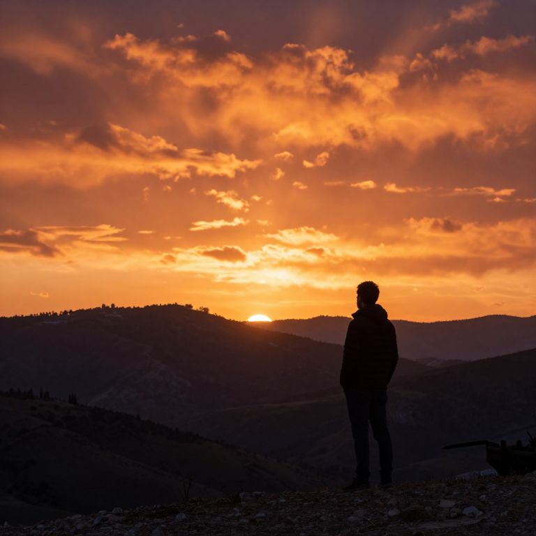 Sunset bathes the Spanish mountains in vibrant hues as a lone figure stands silhouetted against the fiery sky, gazing at the radiant horizon.
