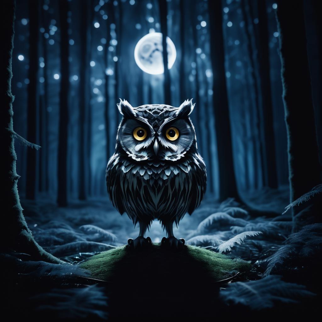 A wide-eyed owl standing on a forest floor under the full moonlight. The scene is set in a dark, dense forest with tall trees and blurred background, creating a mystical atmosphere. The owl has striking orange eyes and detailed feathers, illuminated by the soft light of the moon.