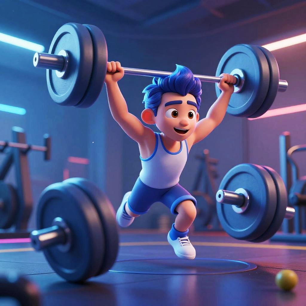 Animated weights lifting themselves in a surreal gym environment, colorful abstract background, smooth fluid animation style, sharp details, vibrant and lively composition