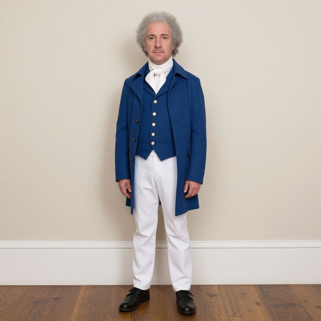 Photograph of an older man with gray, wavy hair, wearing a black coat and white cravat, standing in an ornate, grand