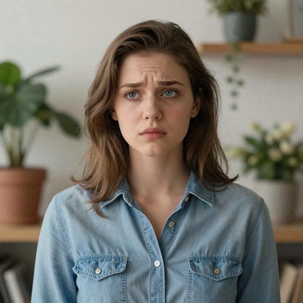 Photograph of a bathroom. A young woman with long brown hair, wearing a black tank top and black underwear, sits on the floor with her knees up and arms around them, looking down. A man with dark hair and glasses, wearing a blue shirt, stands in the foreground, partially out of frame. White door, beige cabinets, and a green wall in the background. Red-striped rug on the floor. The woman's expression is sad and introspective.