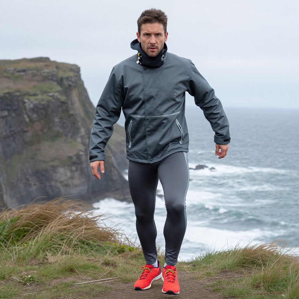 A man, charcoal gray fencing jacket with reflective accents, quick-dry performance leggings, vibrant red training shoes, coastal cliffs, wind-swept grasses, ocean waves crashing below, cinecolor, focused expression, dynamic and energetic vibe. Man has masculine face and piercing eyes