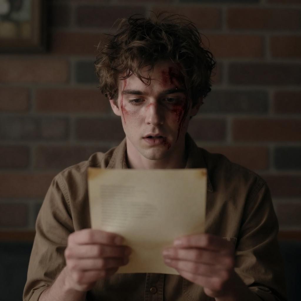 Photograph of a young man with messy brown hair and a bloodied face, wearing a brown shirt, holding a yellowed letter. Dimly lit, rustic background with dark brick wall. Man looks focused, mouth slightly open, gripping letter tightly.