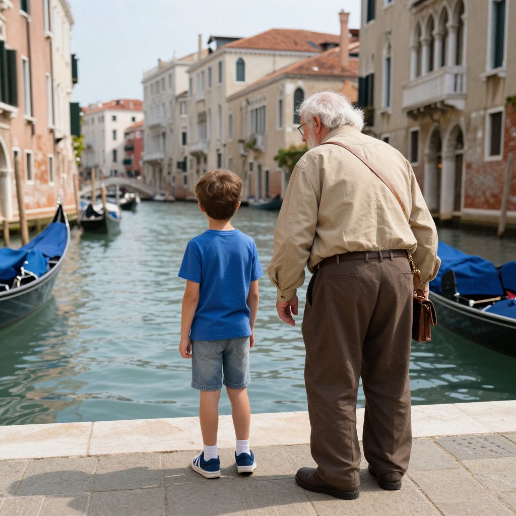 Photograph of an elderly man with white hair and tan shirt, and a young boy in blue shirt and shorts, standing on a canal sidewalk in Venice