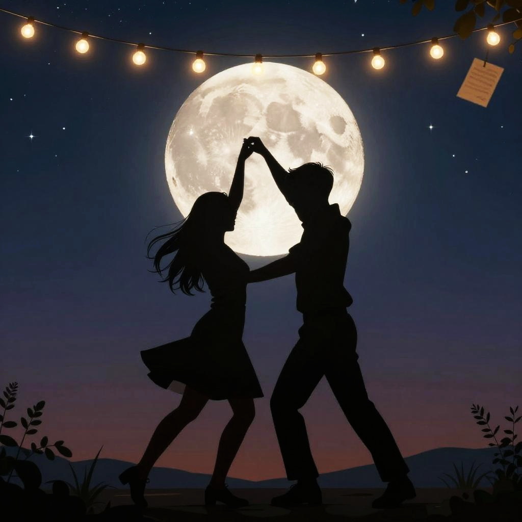 A silhouetted couple dances under a bright full moon by the sea. The man, in dark pants and a shirt, holds the woman, who wears a flowing white dress that billows. The moonlight casts a glow on their forms, creating a romantic, dreamy scene. They're on a path with dark, shadowy trees framing the top. The ocean and horizon are visible in the background.