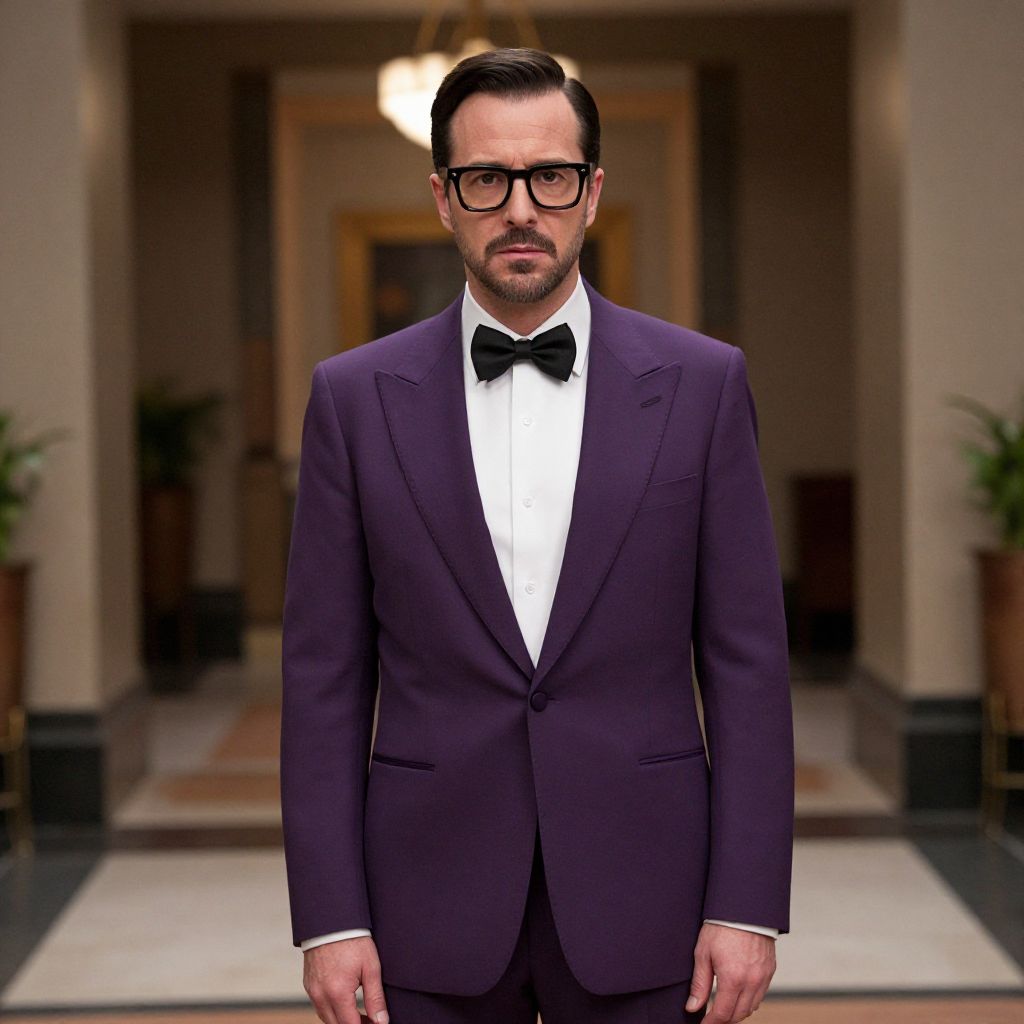 Austin Powers Fancy Dress Boy, man in a purple suit and glasses standing in a hall