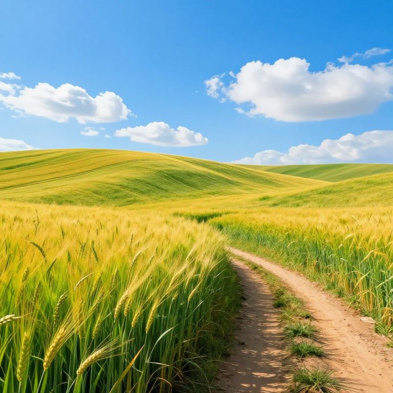 Photograph of a vibrant, sunny landscape featuring a dirt path winding through a golden-yellow wheat field. The field is lush with tall, swaying grasses on either side of the path. In the background, gentle, rolling green hills stretch towards a bright blue sky, dotted with fluffy white clouds. The path is slightly textured with visible dirt and small rocks. The image captures the essence of a peaceful, rural countryside on a clear, sunny day.