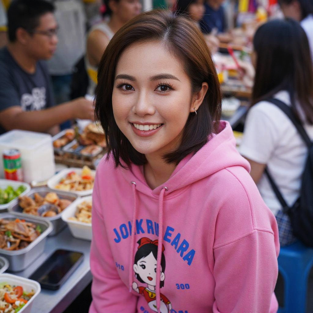 Photograph of a smiling young Asian woman with shoulder-length black hair, wearing a pink hoodie with "Dokira Era" and a cartoon print. She is seated at an outdoor food market, surrounded by various dishes in white plastic trays. Background includes blurred people, some eating, and colorful food stalls. The woman's skin is fair, and she has dark eyes. The market atmosphere is lively, with vibrant colors and textures, emphasizing a casual, social setting. The image is brightly lit, highlighting the subject's cheerful expression.