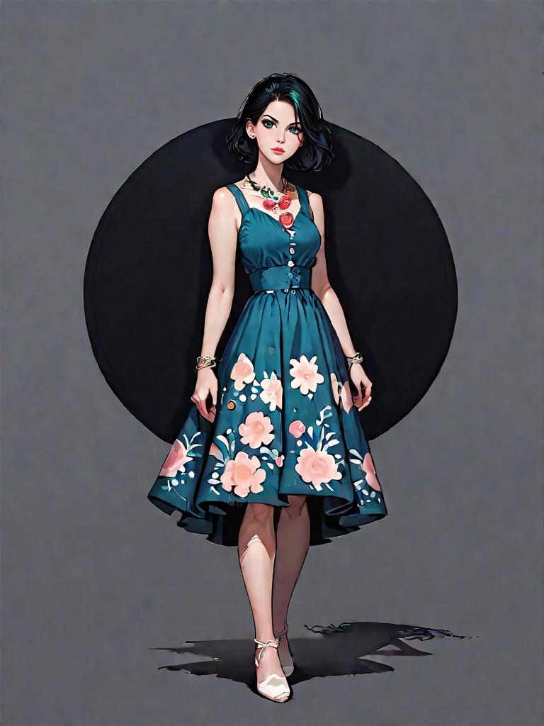 1girl, source_comics, realistic face, full body shot, Woman, casual bohemian, sleeveless mini shift dress in a dark palette with pink and green floral print, scoop neckline, straight silhouette, thin bracelets, layered beaded necklaces, grey studio background