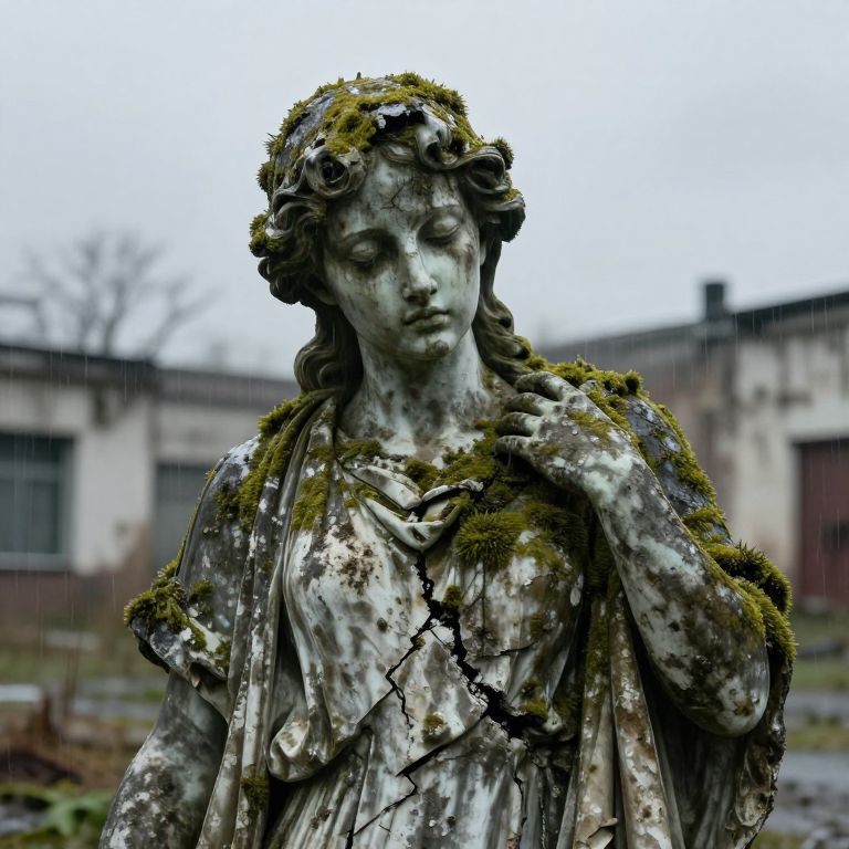 Taint represented by a decaying statue in a deserted urban environment, covered with moss and cracks, under an overcast sky with rain, symbolizing neglect and entropy, focusing on gritty textures and emotional impact.
