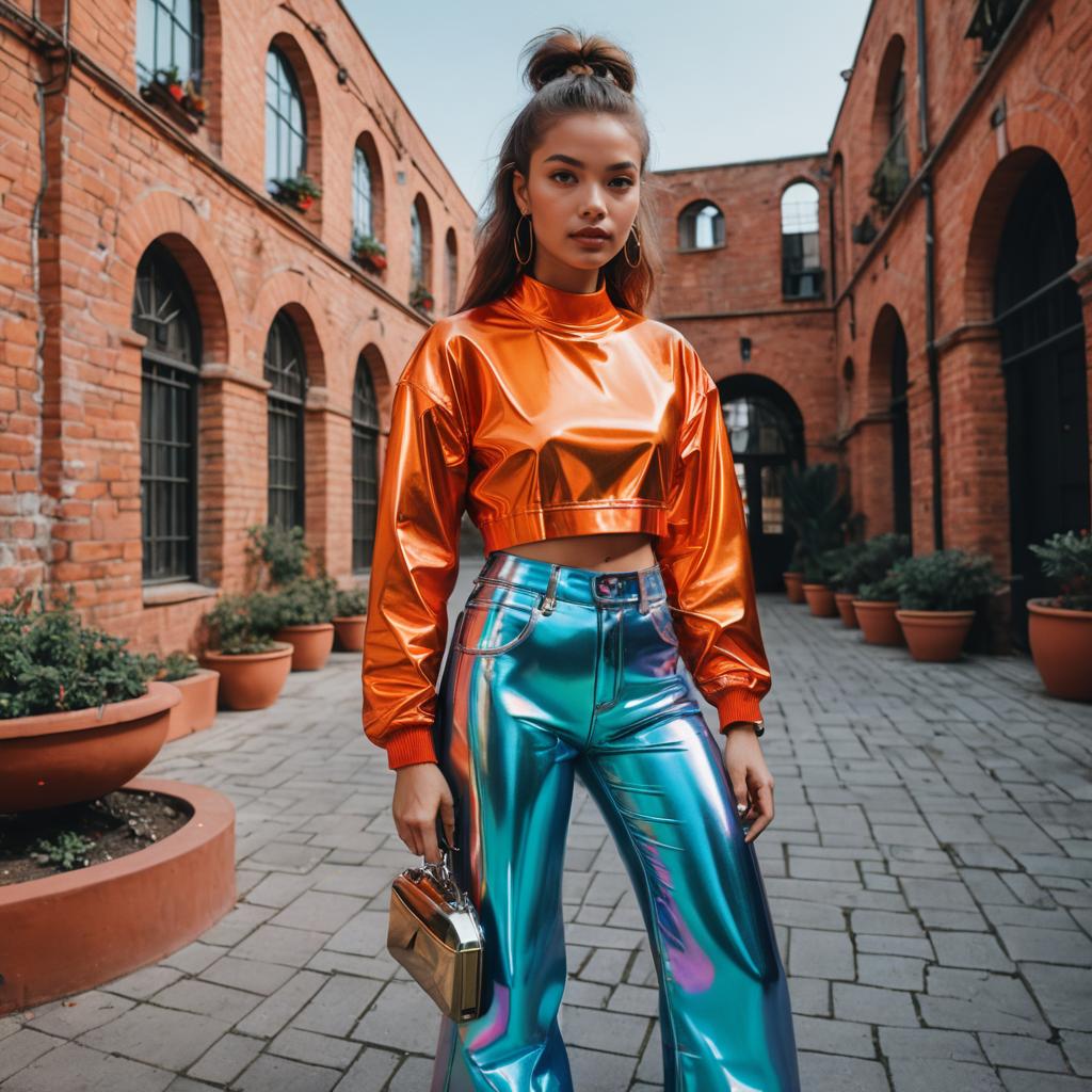 Portrait of a woman with a ponytail standing in a castle-like courtyard wearing a bright coquelicot orange crop top and shiny metallic blue low-rise flared polyester jeans. She accessorizes with chunky holographic sneakers and a black backpack, combining Y2K style with futuristic metallic fabrics. The image features bold colors and graphic film photography style.