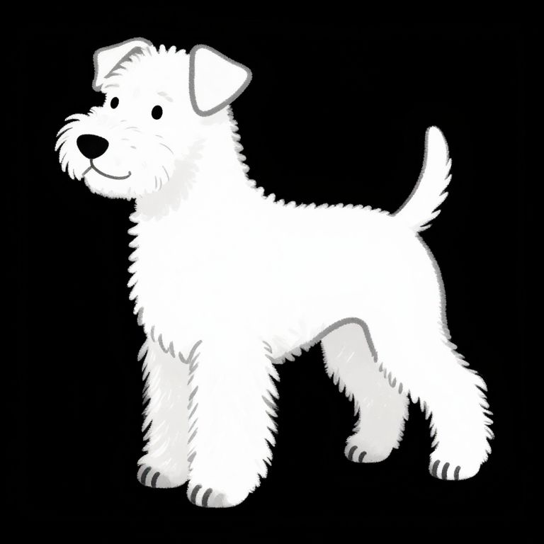Digital drawing of a white, fluffy terrier dog standing on a solid black background. The dog has a slightly scruffy coat, a small black nose, and black eyes. Its ears are floppy, and it has a bushy tail that is curved upwards. The dog is positioned in profile, facing to the left, with a slight smile. The image uses high contrast with white for the dog and black for the background, giving it a stark, bold appearance. The drawing style is simple and cartoon-like, with clean lines and minimal shading.