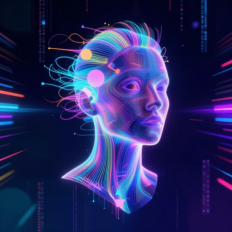 Body creator generating a surreal digital avatar made of flowing neon lines and geometric shapes, floating in a virtual space filled with data streams and abstract tech patterns, vibrant colors and dynamic motion, futuristic and artistic visualization.