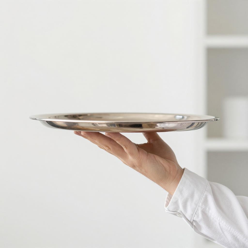 Photograph of a hand holding a silver tray at a slight upward angle, against a white background. The hand is wearing a white, long-sleeved shirt. The lighting is even and bright, highlighting the tray and hand. The background is completely white and blurred, keeping the focus on the hand and tray. The depth of field is shallow, with a clear, detailed foreground and a softly blurred background.